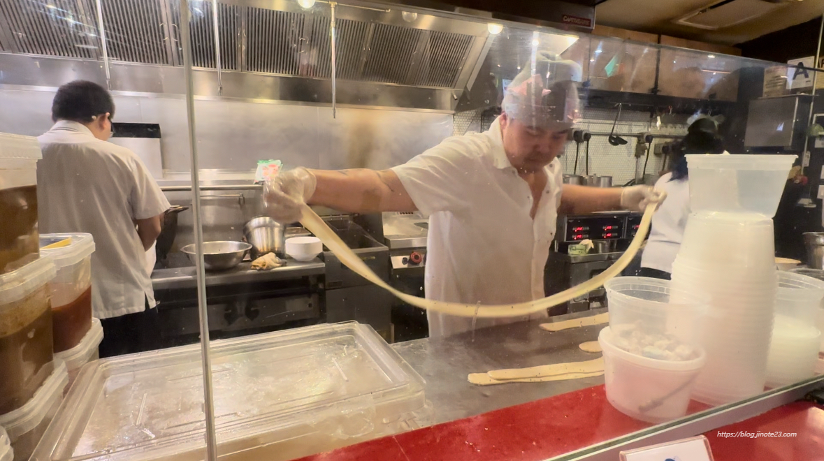 테이블 앞 가림막 너머로는 주방이 다 보이고, 바로 앞에서 직접 수타로 면을 만드는 과정을 볼 수 있습니다. 제가 먹으면서 계속 지켜본 바로 뭔가 지켜보는 사람이 많다 싶으면 더 크게 공중으로 돌리면서 기교를 보여주기도 하는 것 같더라고요.