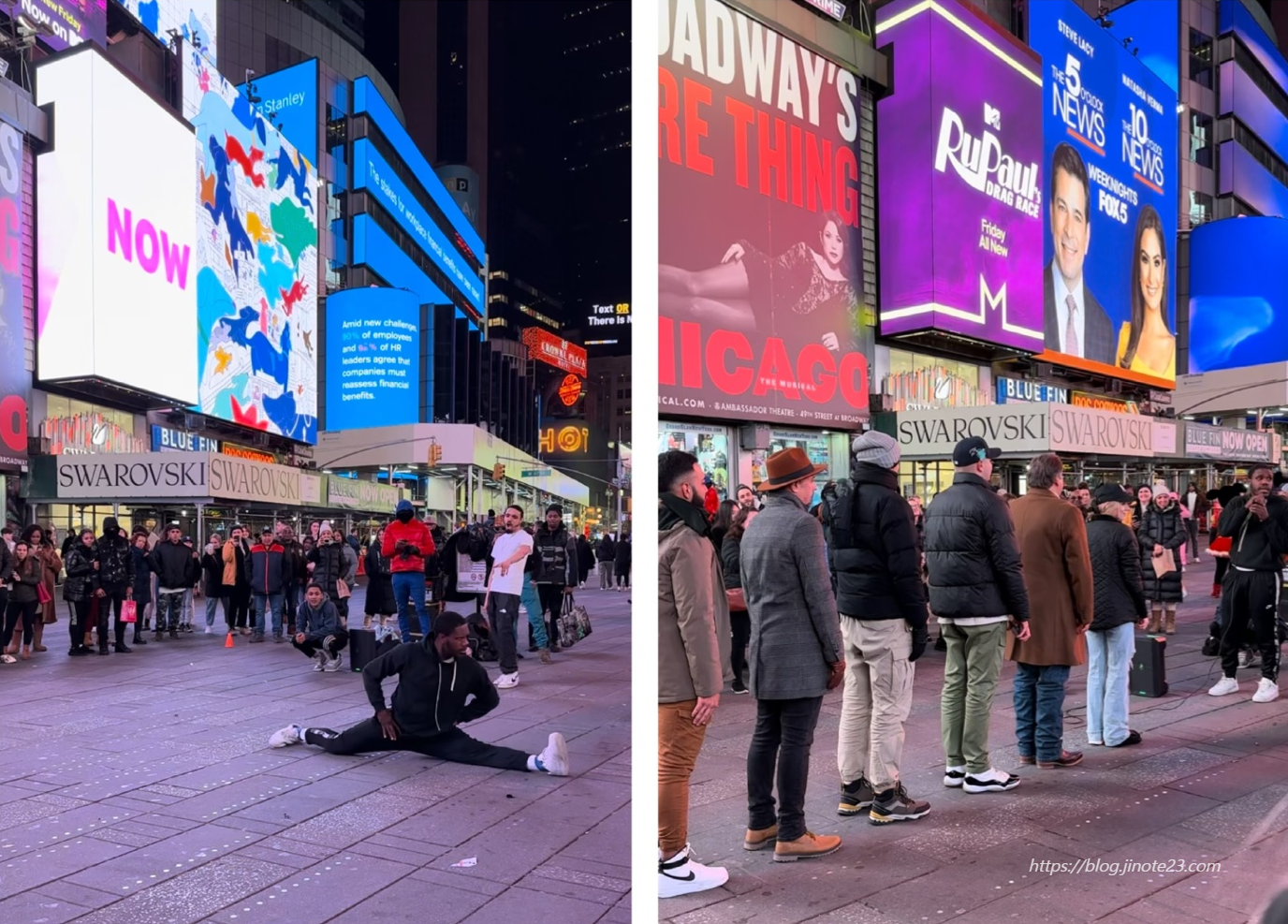 미국의 밤거리는 조심해야한다는 말을 많이 들었지만 뉴욕 맨해튼의 중심인 이곳에서는 밤이 늦도록 여전히 사람들이 많고 활동적이었어요. 잠들지 않는 도시라는 말이 딱 맞네요. 길거리에서는 비보이들의 공연과 관객들이 함께 참여하는 쇼도 진행하고 있었어요.