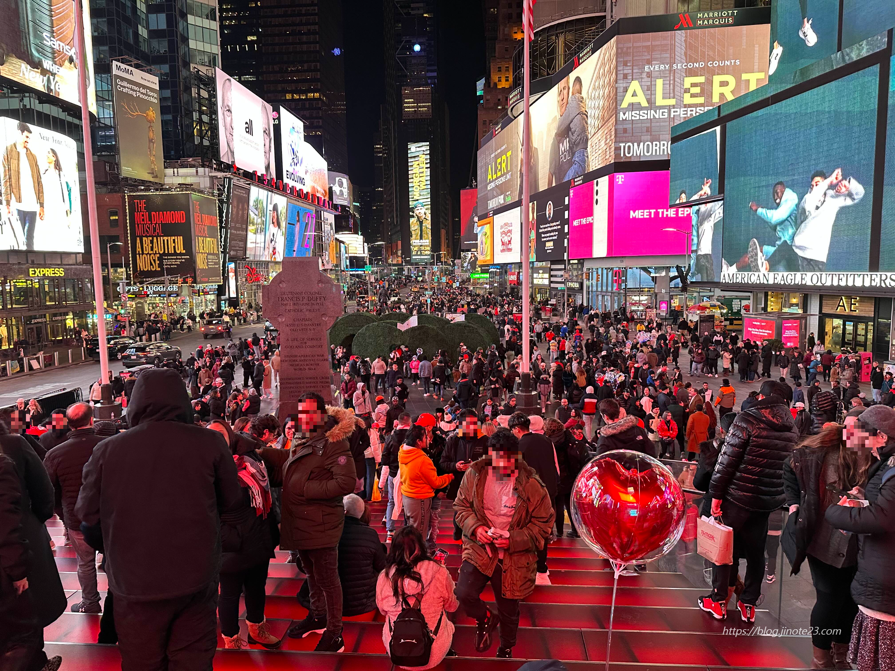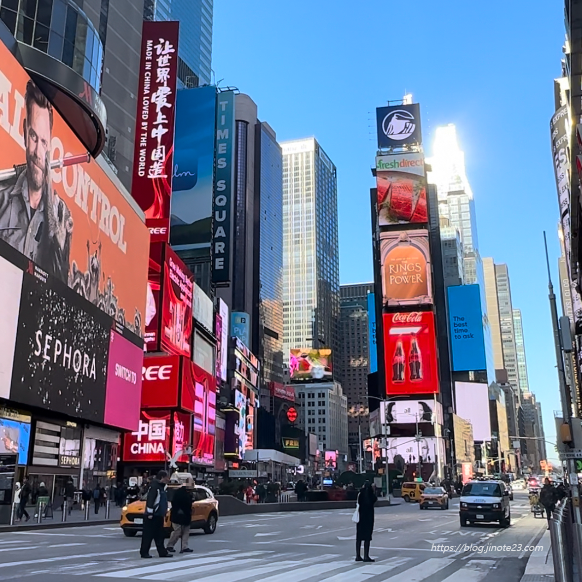 저기 전광판 앞 빨간 계단에 올라가서 쭉 둘러보면서 사람들 구경하기 좋고, 앉아서 멍 때리기도 좋은 것 같아요. 평일 낮의 타임 스퀘어는 많이 붐비지 않았어요.