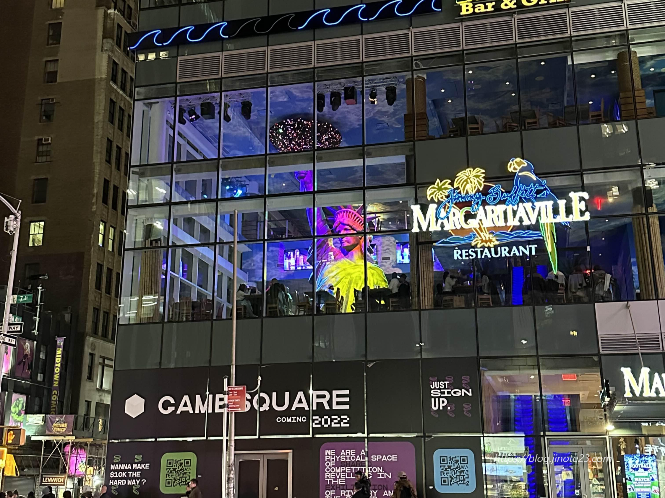 저녁의 타임스퀘어는 낮과는 또 다른 느낌을 주더라고요. 저녁임에도 전광판으로 거리를 환하게 비춰서 야경을 즐길 수 있었어요.