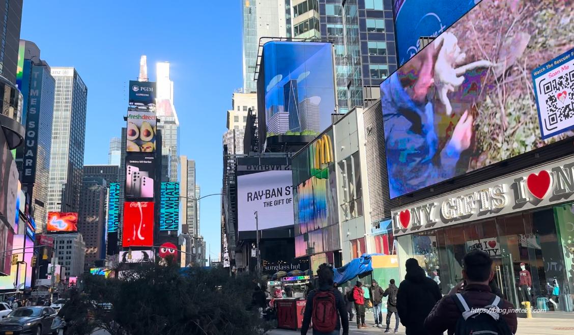 화려한 LED조명판으로 둘러싸인 뉴욕 맨해튼의 중심 타임스퀘어. 뉴욕에 왔다면 안 와볼 수 없는 곳이죠! 뉴욕에 도착해서 처음으로 본 타임 스퀘어 모습이에요. 주변이 모두 높은 건물들로 둘러싸여 있어서 저 멀리서 긴가민가하다가 뒤늦게 타임스퀘어를 알아봤습니다.
