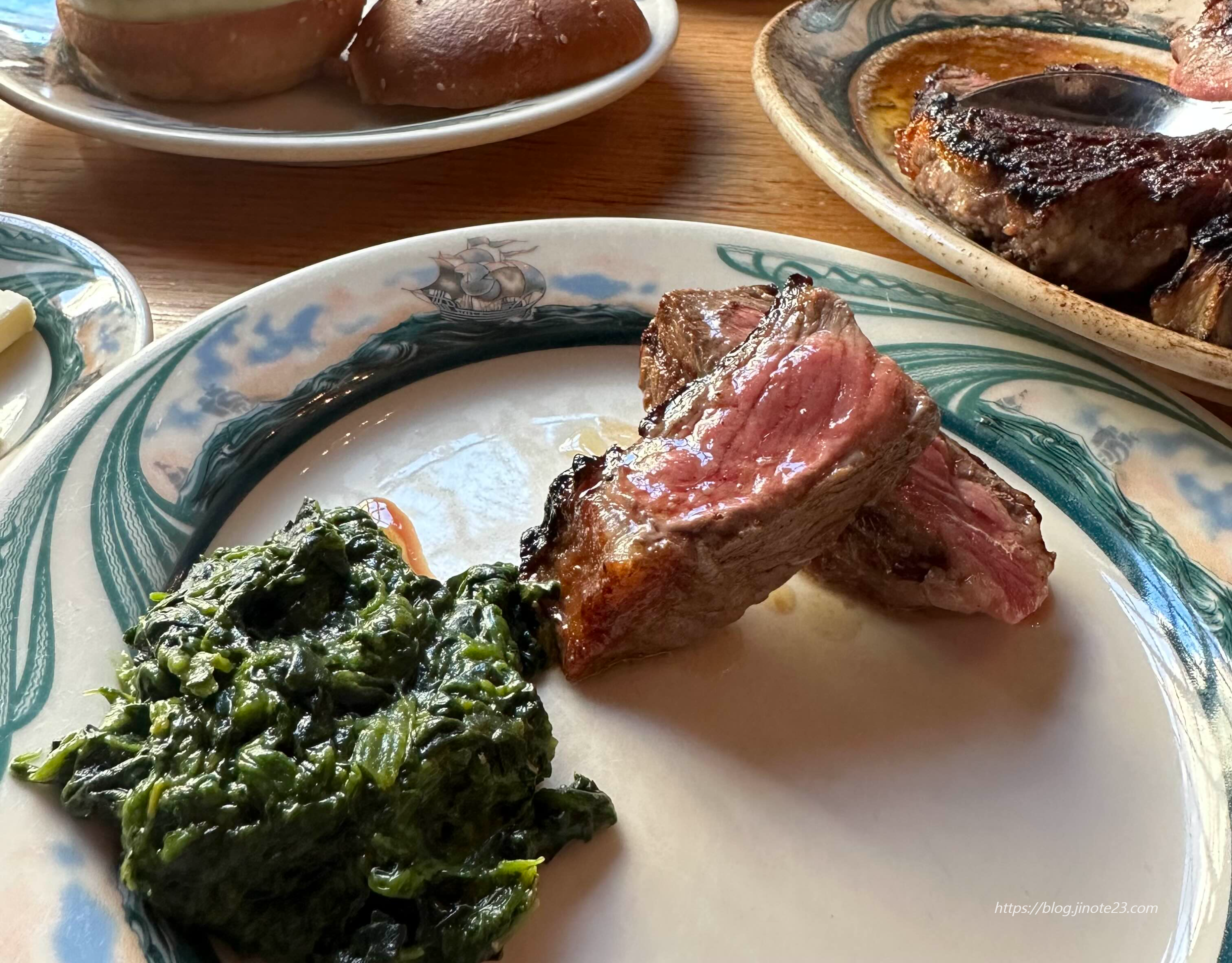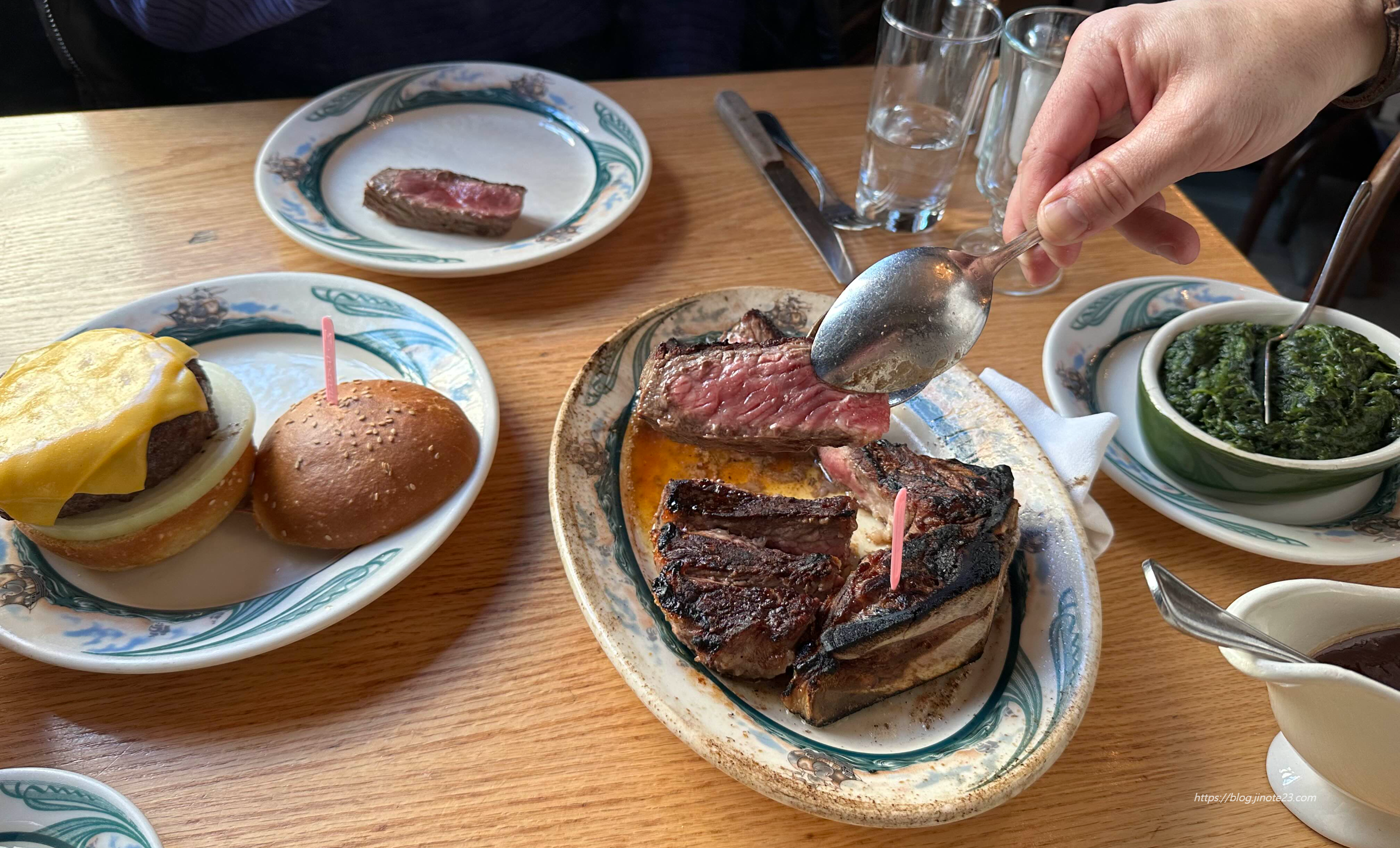 스테이크가 나오면 직원분이 부위를 보여주시면서 설명해 주시고 앞접시에 놓아줍니다. 사이드로 시킨 크림시금치도 함께 올려주셨어요.