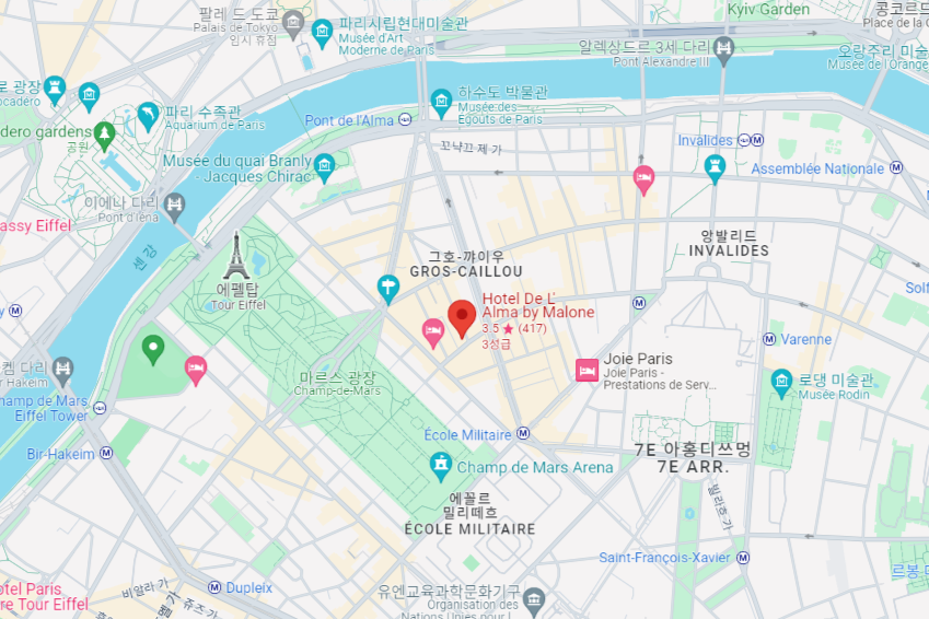 7구에 위치하고 있고, 에펠탑 근처에 있는 곳입니다. 대중교통이 근접해 있어 약 10분 정도만 걸으시면 버스나 지하철을 타고 관광지까지 이동하실 수 있습니다.