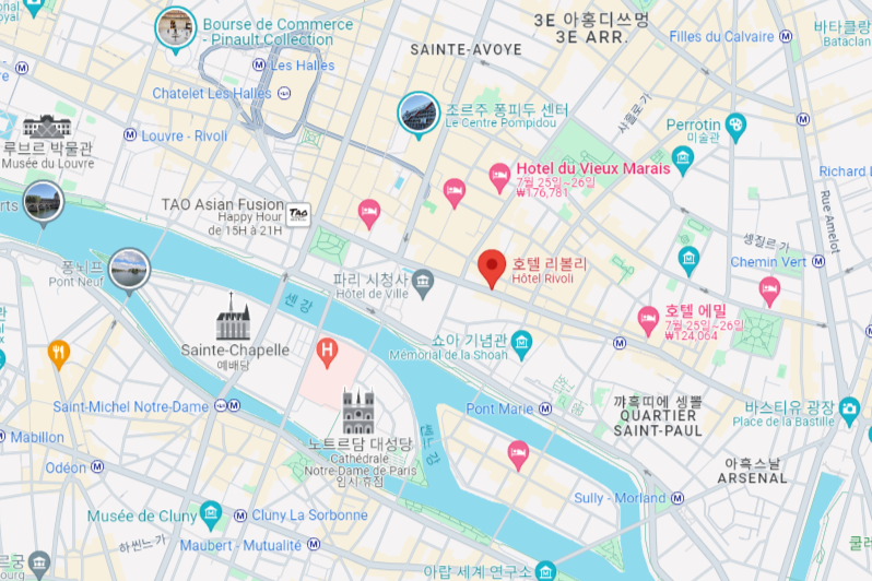 4구에 위치하고 있고, 조르주 퐁피두 센터와 노트르담 대성당 근처에 있는 곳입니다. 버스와 지하철 등 대중교통이 인접해 있어 편리하게 이동할 수 있습니다. 이곳 주변이 마레지구이기 때문에, 다양한 쇼핑 명소를 도보로 즐기기에 좋습니다.