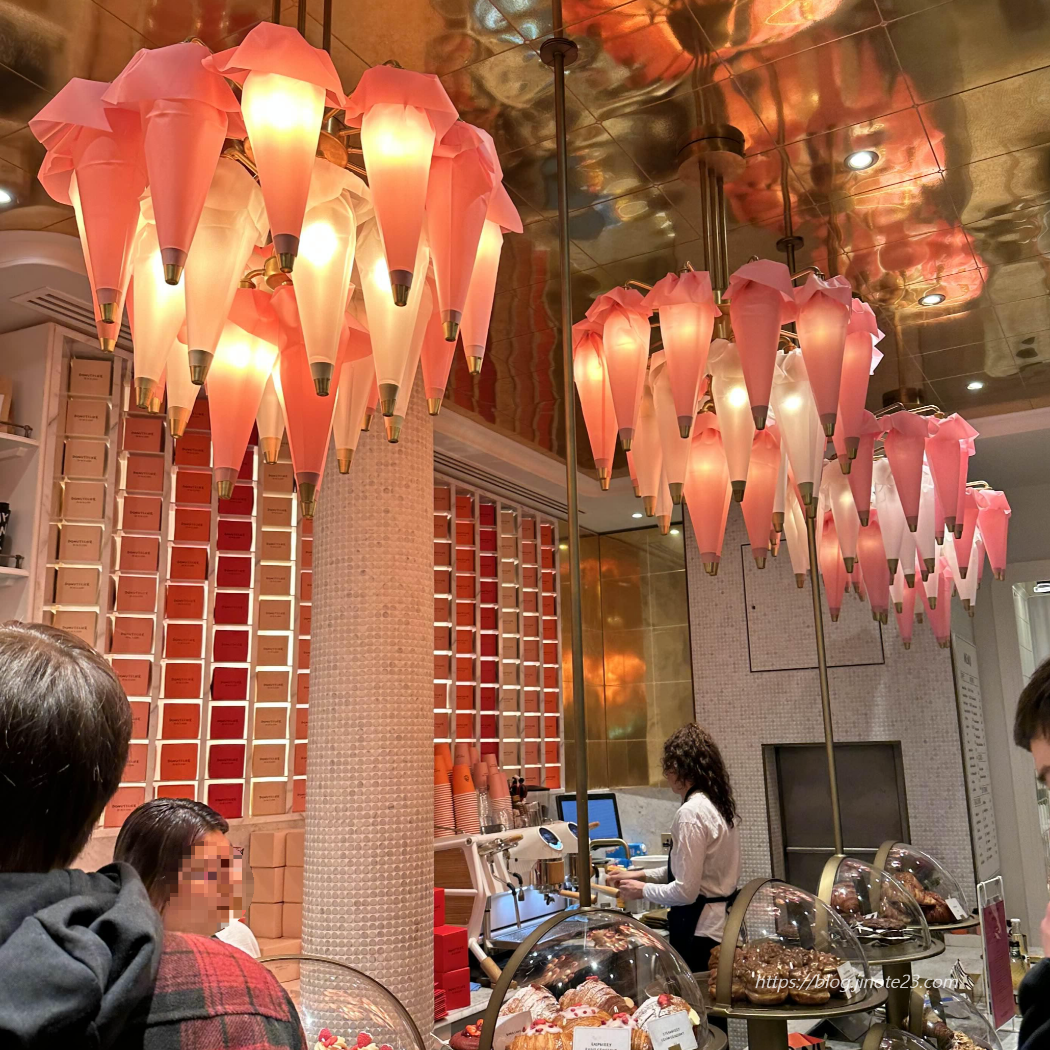 엄청 넓더라고요. 클로즈시간까지 열심히 돌아다녔습니다. 저녁 먹으려고 가는 길에 사람들이 많은 베이커리 가게에 이끌려 들어갔어요. 나중에 호텔에 돌아가서 크로와상이랑 도넛을 먹었는데 맛있었어요. 그보다 저 전등을 짤주머니처럼 해둔 게 참신하고 이쁘더라고요.