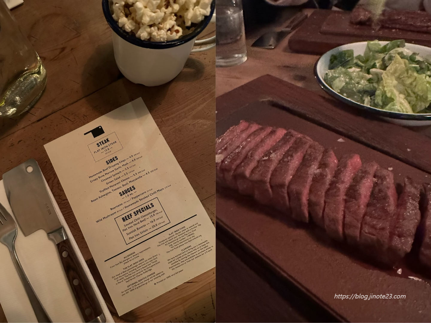 팝콘을 먹으면서 기다려줍니다. 스테이크는 특별한 것은 모르겠지만 부드럽고 맛있었습니다. 와인과 함께 드시기도 좋은 분위기였어요. 다 드시고 나면 엄지손톱만 한 나이프 같은 걸 주는데 이걸 들고 입구로 나가면 아이스크림으로 바꿔준답니다. 근데 이 아이스크림이 진짜 맛있었어요.. 아이스크림가게를 따로 해도 잘 될 것 같은.. 그런 제 취향저격 맛이었습니다!