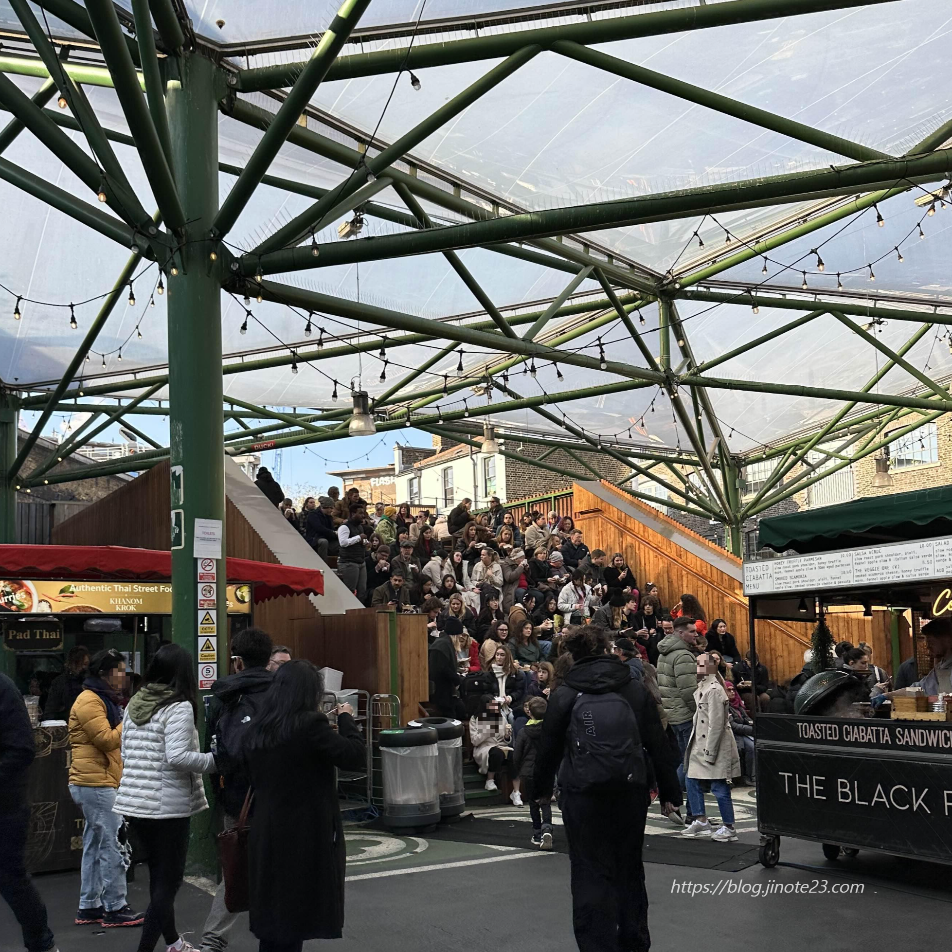 여기 안에는 앉아서 식사할 수 있는 곳이 거의 없어서 사람들도 음식 받아서 서서 먹더라고요. 더 야외로 나가보면 가게가 더 나오는데 그곳 앞에는 저렇게 앉아서 먹는 곳이 있습니다. 약간 불편할 수도 있지만 괜찮았어요.
