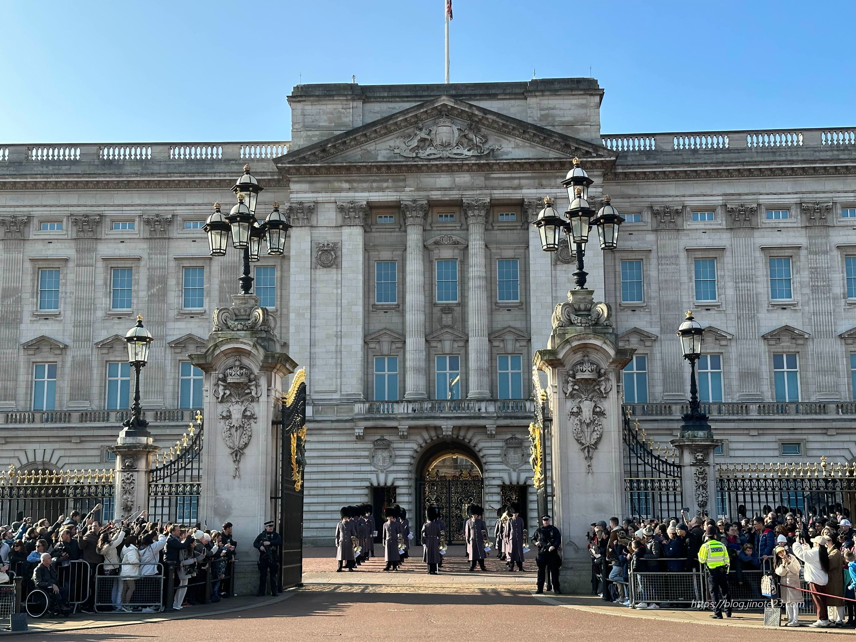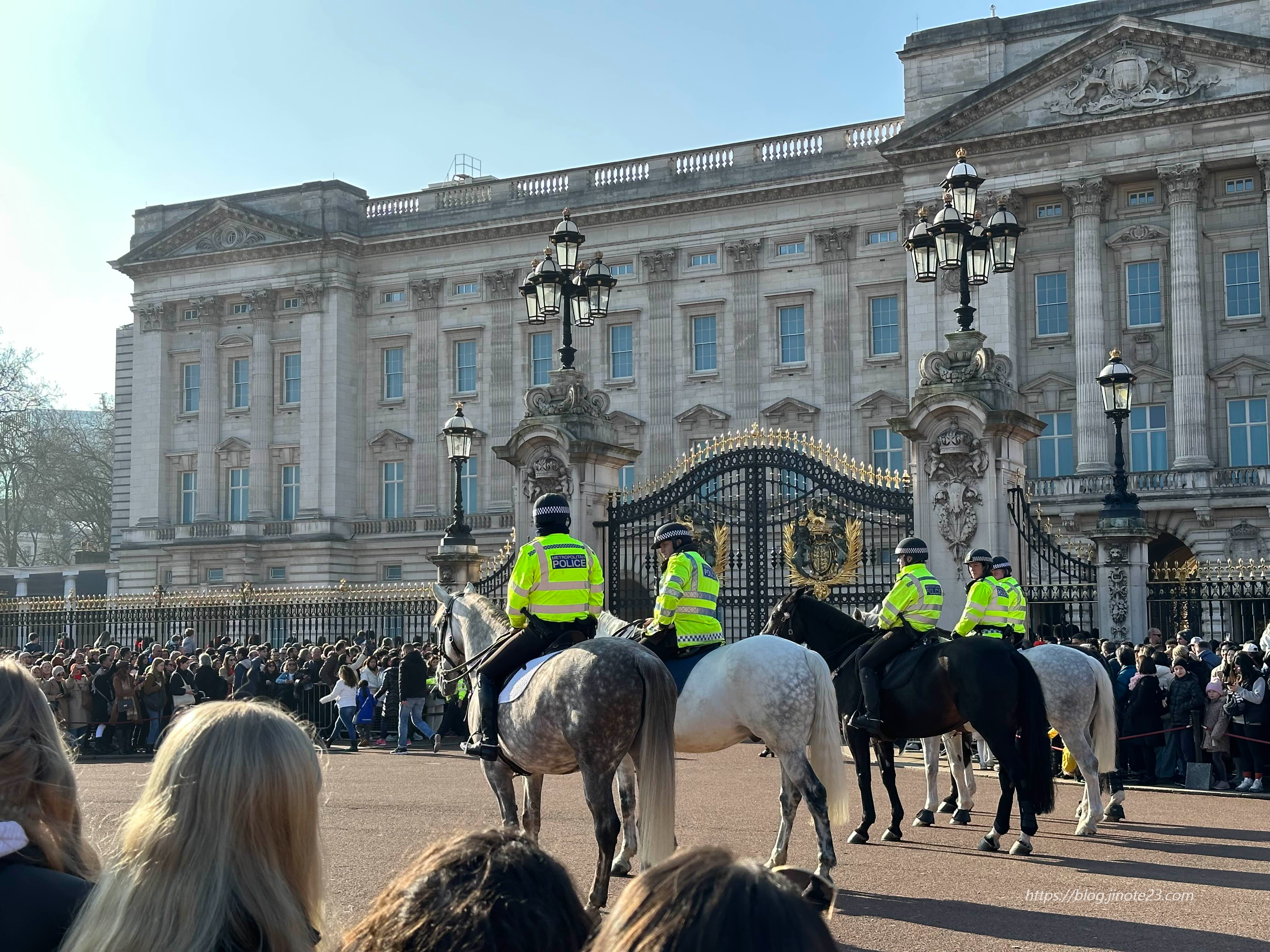 드디어 런던에 밝은 날이 찾아왔어요! 서둘러 버킹엄 궁전(Buckingham Palace)에 왔습니다. 홈페이지에서 본 시작시간보다 살짝 늦었는데 안에서만 식이 진행되고 있는 것 같았습니다. 많은 사람들이 와서 기다리고 있었고, 저희는 빅토리아 기념비 앞에 기다리고 있었어서 안에서 진행되는 것들은 보기 어려웠습니다. 조용히 진행되지만 중간중간 소리는 들렸어요.