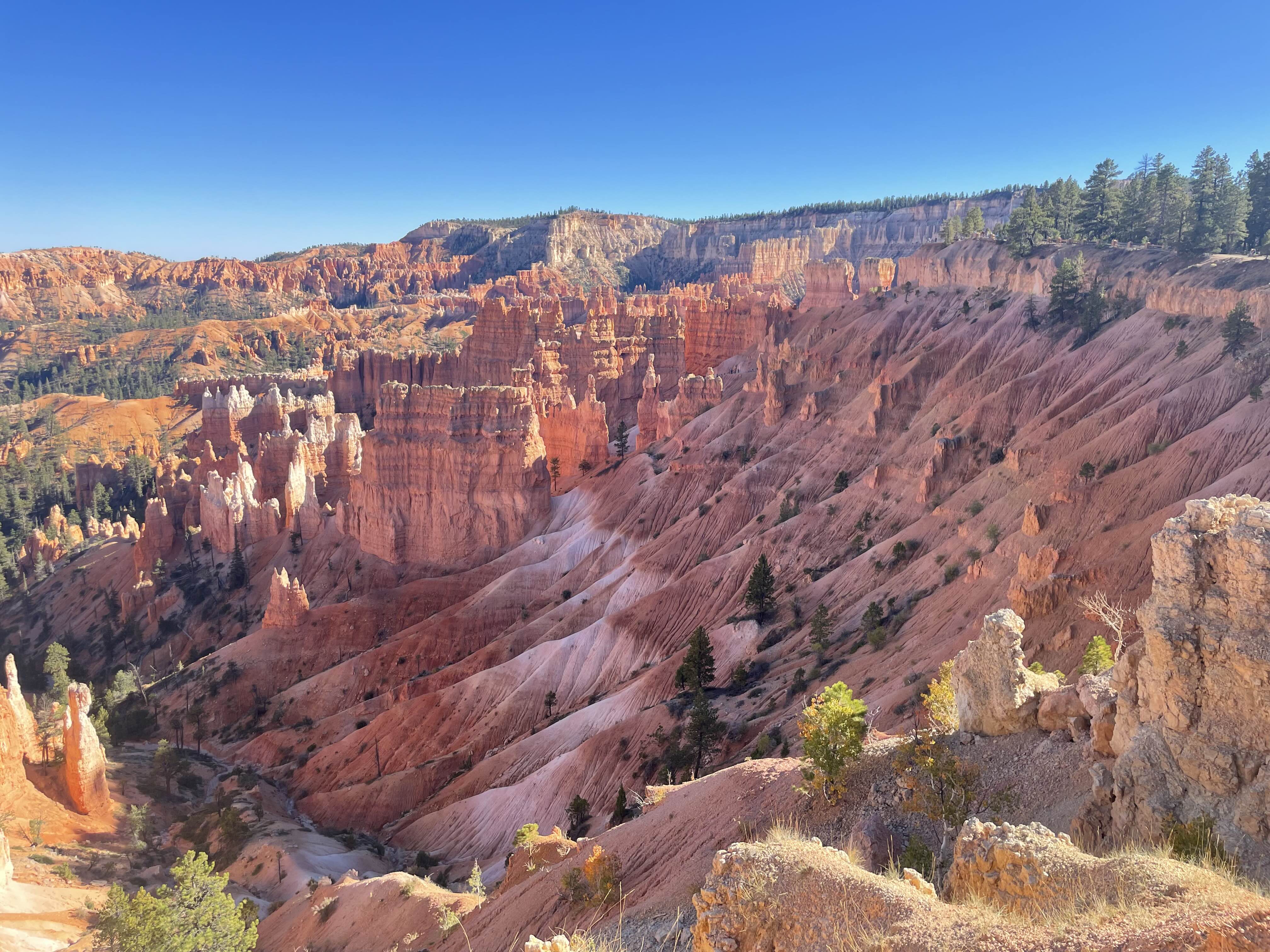 보자마자 우와 소리가 나왔던 브라이스 캐년. 자이언은 남성 같은 우직함이라면 브라이스는 여성 같은 우아함으로 알려져 있어요. 자연적으로 저런 모양이 형성되어 자리 잡고 있다는 게 신기했습니다.