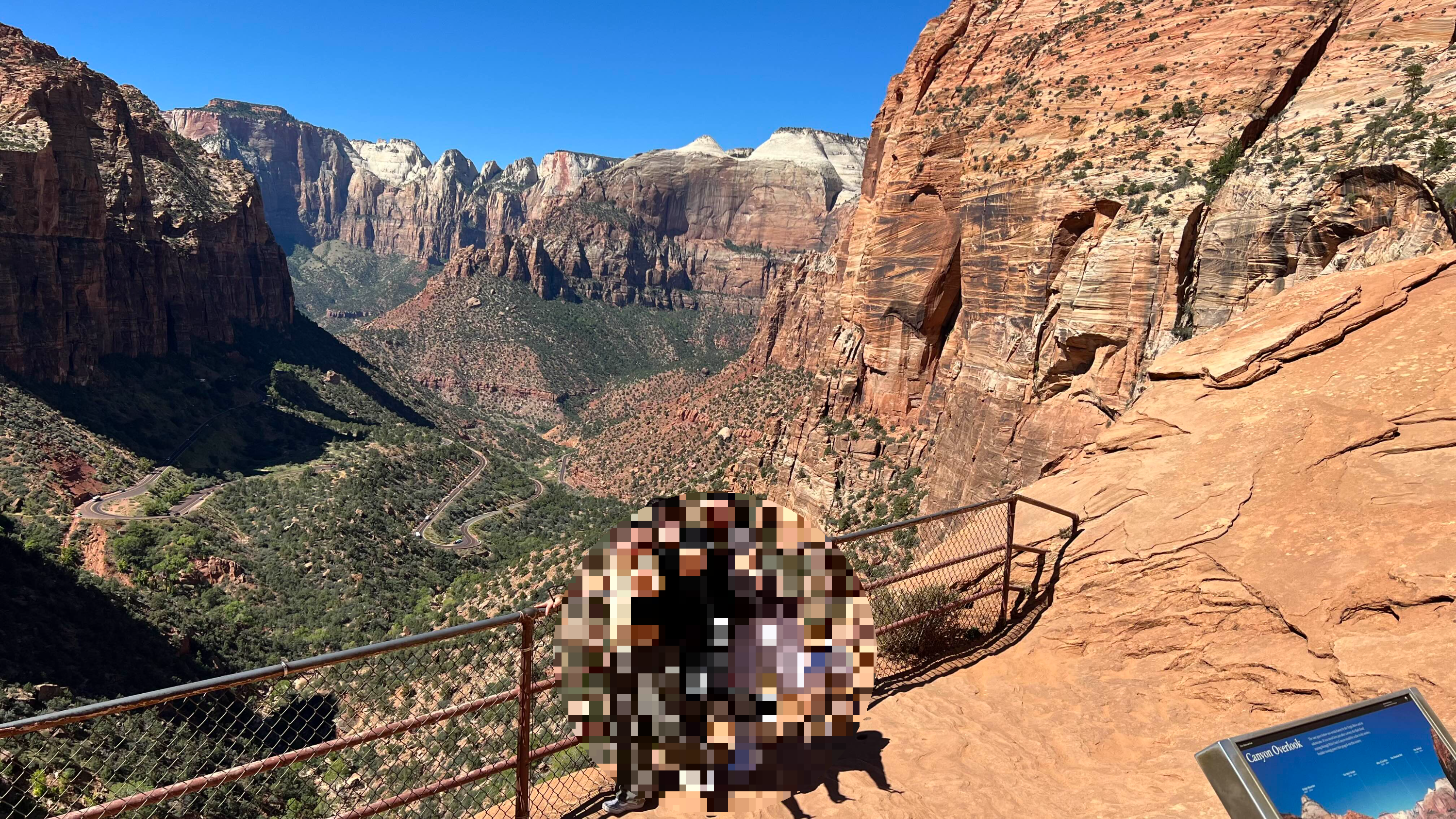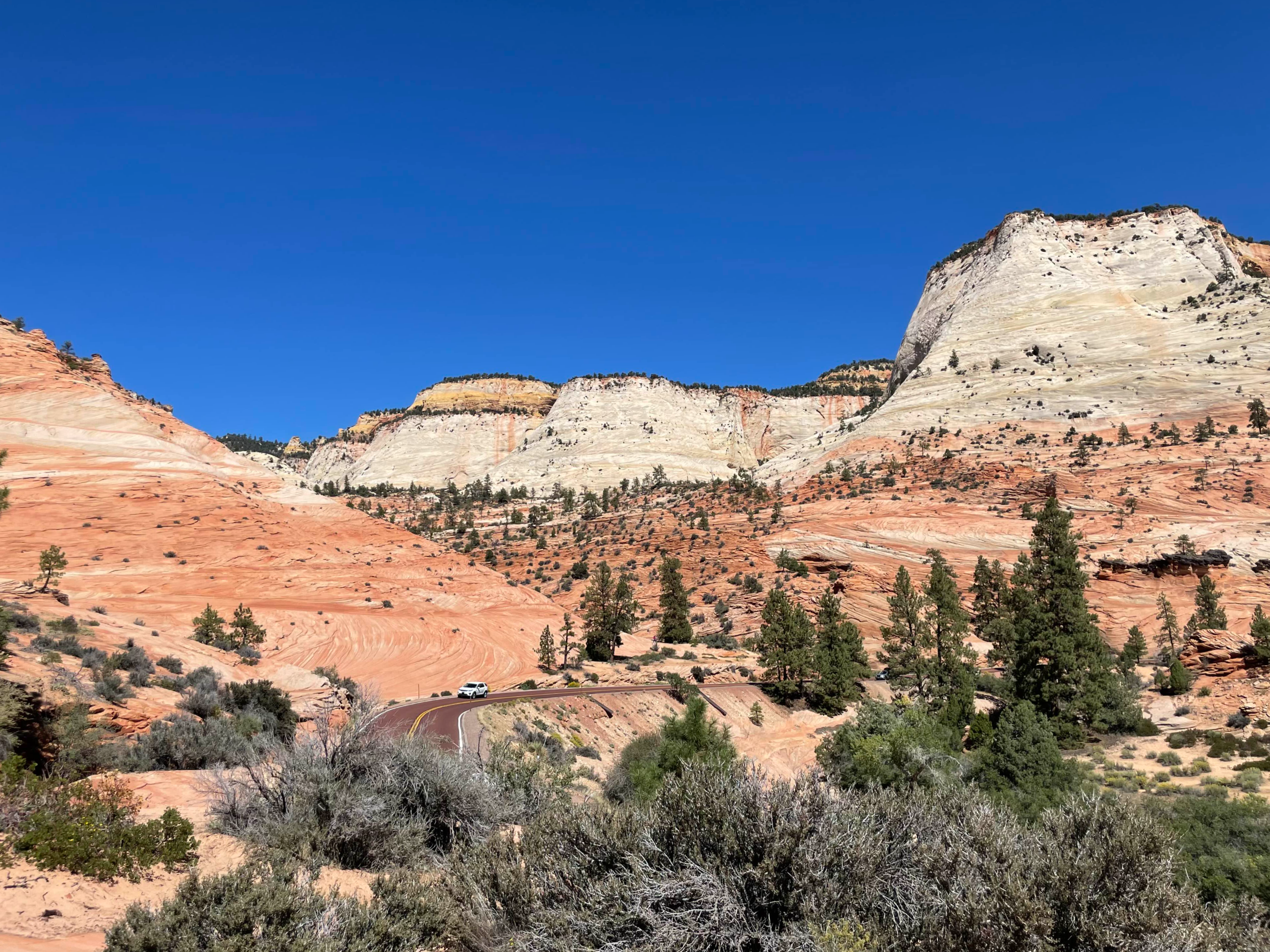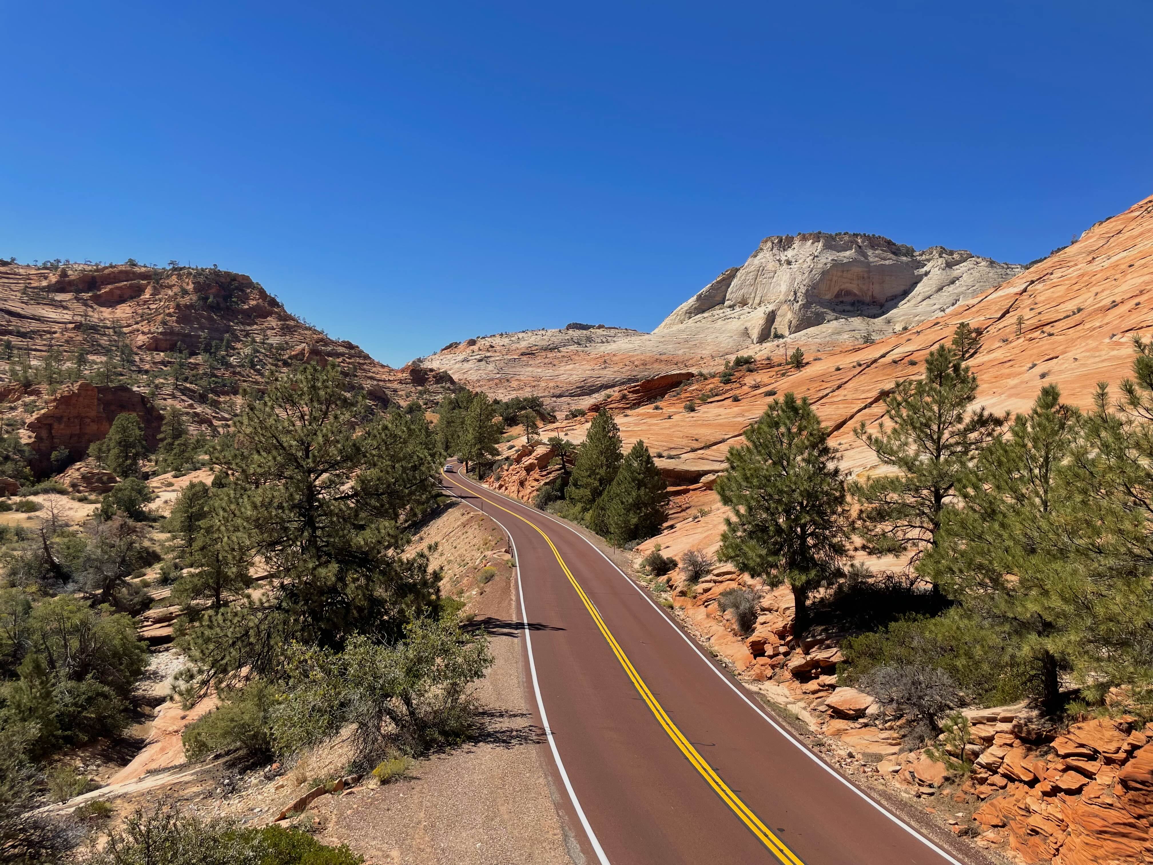 여기는 자이언에서 내려오는 중간 지점에 있는 곳이에요. 저 도로가 버건디 색이라는 게 특별한 점이라고 하셨어요. 그래서 그런지 주변 자연과 더 잘 어울리는 것 같더라고요. 여기서도 내려서 사진 찍어주시고 다시 출발했습니다.