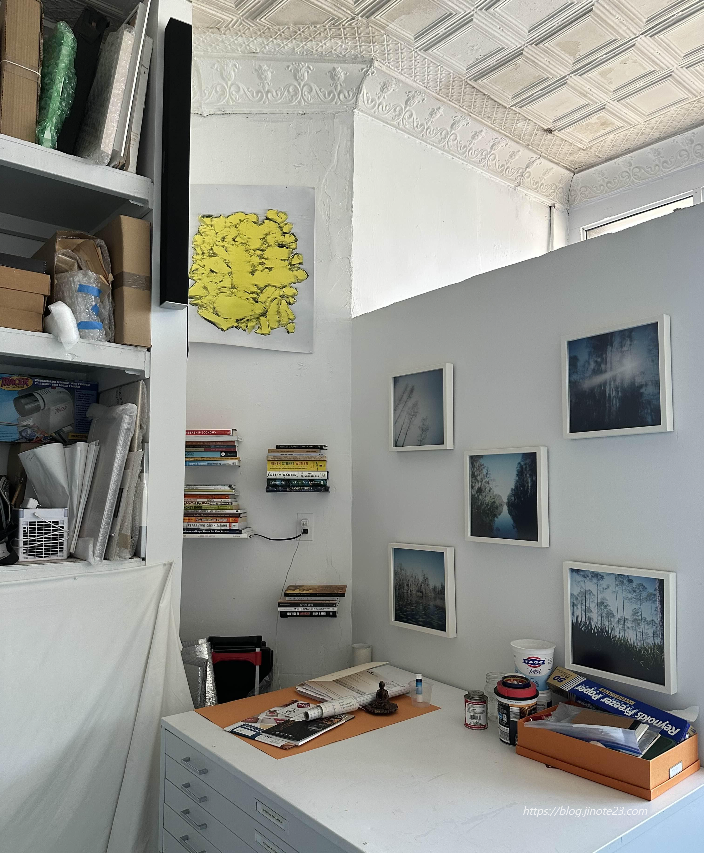 큰 창이 있어서 밖에 사람들 지나다니는 걸 구경할 수 있습니다. 안에는 호스트분이 사용하는 사무공간과 미술 쪽 일을 하셔서 아트공간도 있습니다. 여기 걸려있는 그림들을 다 직접 만든 거라고 하시더라고요.