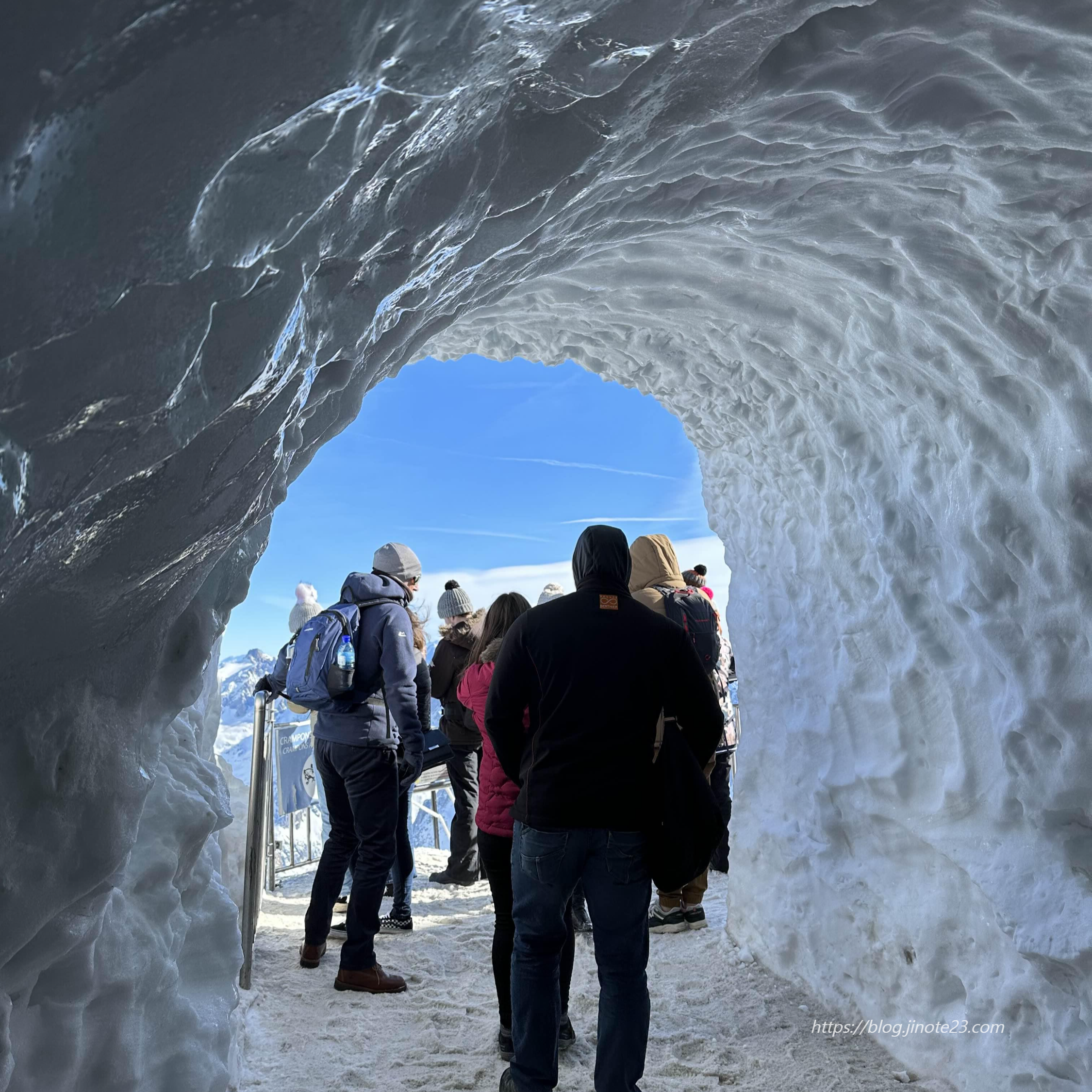 저런 산에 둘러싸인 곳에 도착하고, 여기에 도착해서 아래 계단으로 내려가면 얼음동굴(Mer de glace)로 구경하러 갈 수 있습니다. 얼음 동굴은 프랑스에서 가장 길고 큰 빙하인데 지구온난화로 빙하가 녹아내리고 있어서 크기가 줄고 있다고 하네요. 근데 꽤 많은 계단을 내려가야 한다고 하길래 내려가지는 않았어요.
