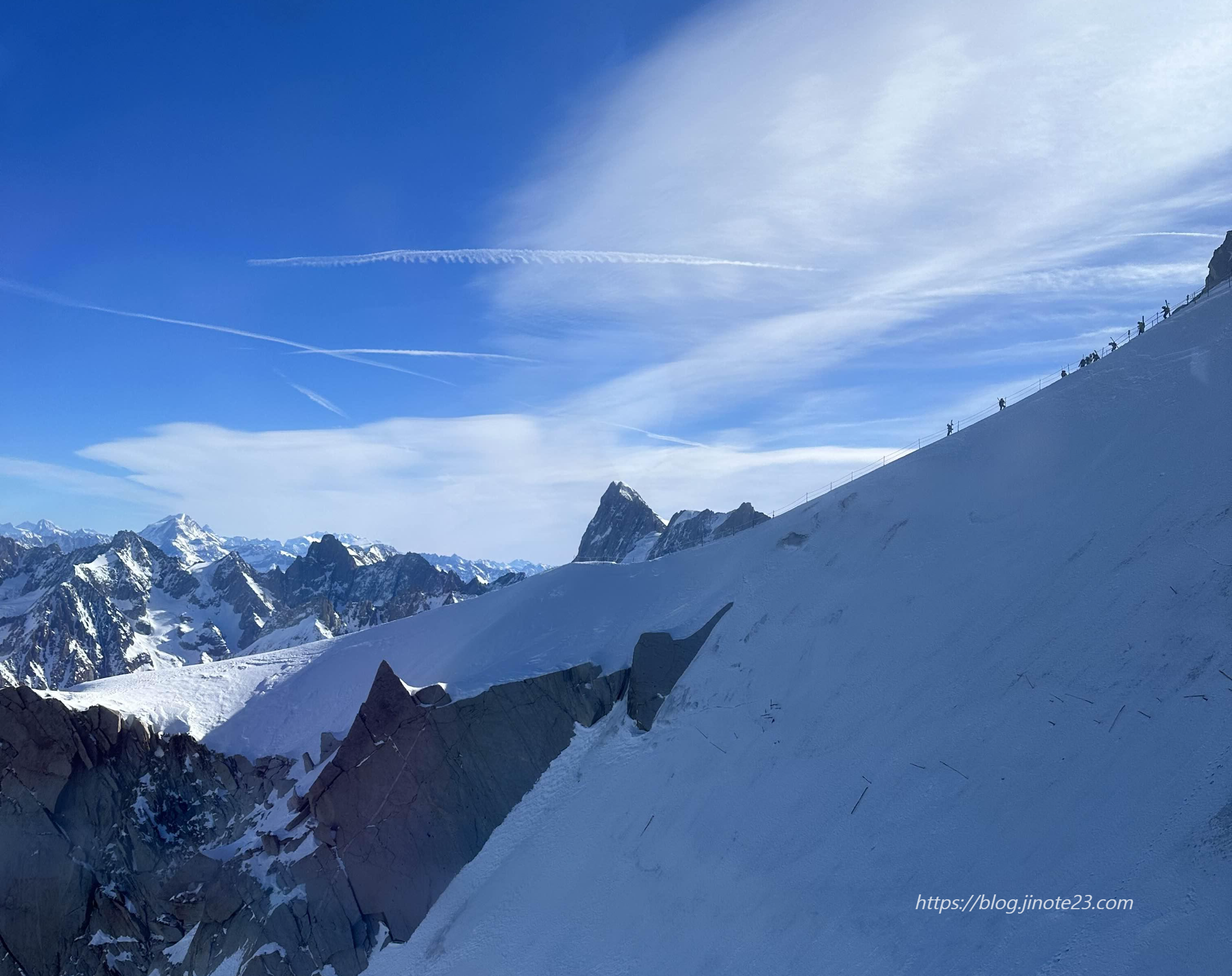 그래서 그런지 오전 6~7시부터 많은 사람들이 스키를 타러 가고 있었어요. 제 눈에는 거의 다 스키나 보드 타려는 사람들 같아 보였어요. 저는 짐만 맡겨두고 에귀 뒤 미디(l'Aiguille du Midi)로 갔습니다. 에귀 디 미디는 알프스 최고봉인 몽블랑을 가장 가까이서 만날 수 있는 곳으로 케이블카를 타고 15분이면 정상까지 갈 수 있어요.