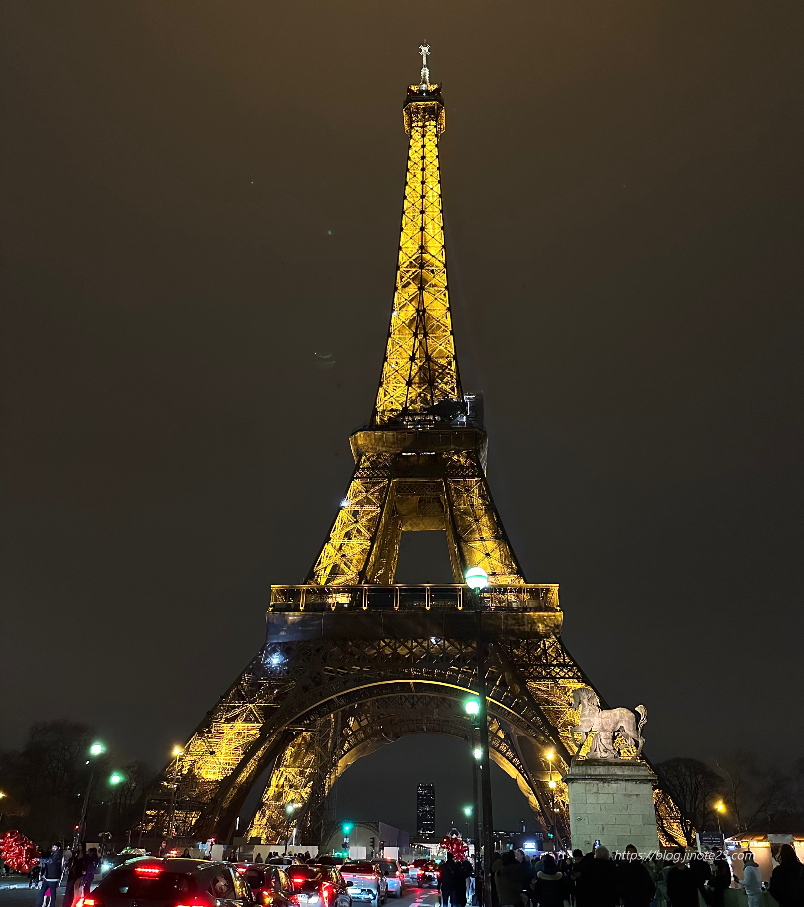 개선문 옆으로 펼쳐진 샹젤리제 거리를 따라 조금 걷다가 에펠탑(Tour Eiffel)을 보러 왔습니다. 저녁에 봐도 이쁘네요. 저는 파리에 오면 에펠탑 근처 공원에서 돗자리 펴놓고 앉아서 쉬고 싶었는데 겨울이라 춥기도 하고 막아놔서 들어갈 수 없었습니다.. 아쉽지만 다음 기회를 노려봅니다!