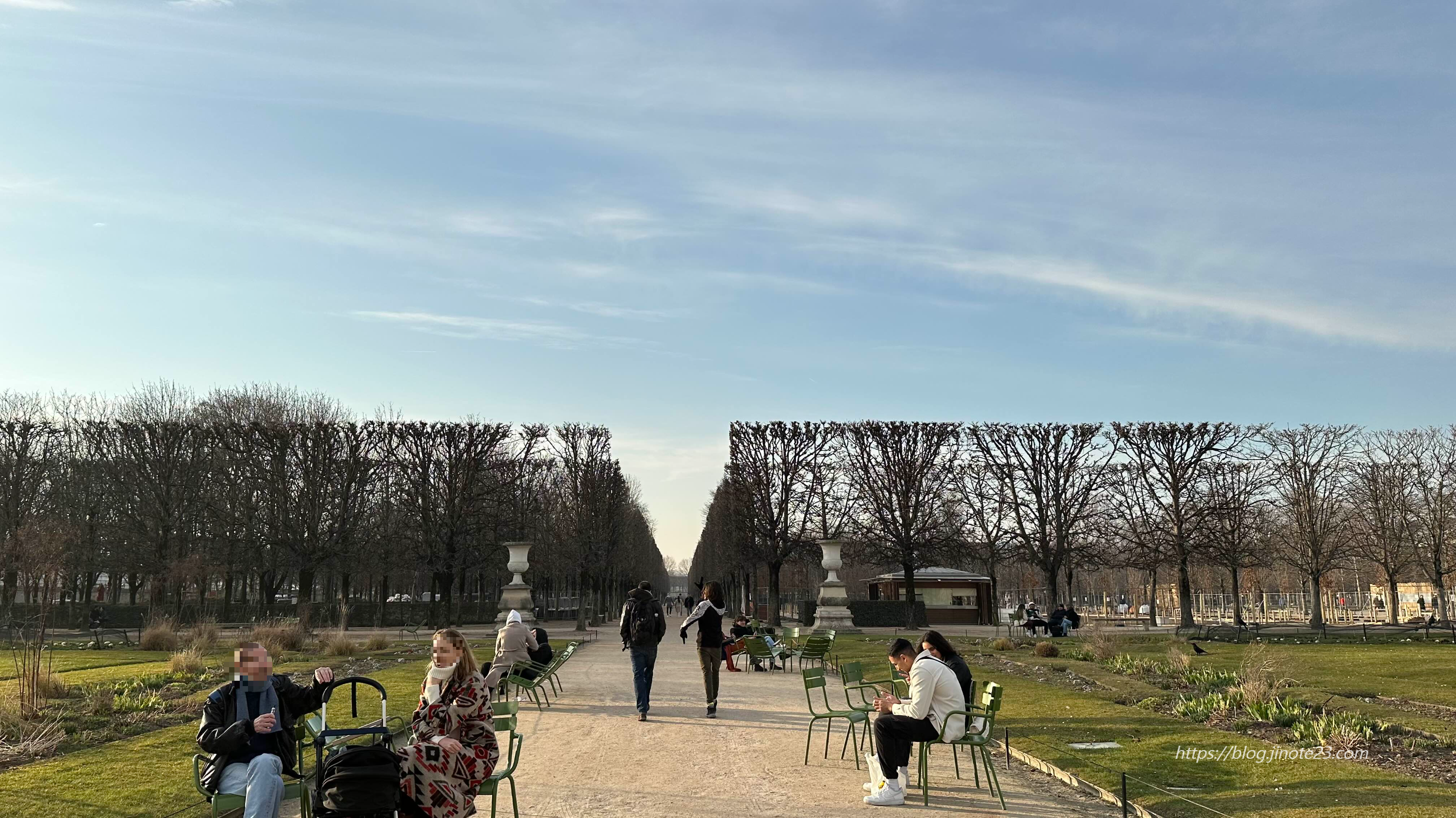 나와서 뛸르히 정원 쪽으로 걸어가는데 그 양옆에 있는 나무들 또한 정갈하게 다듬어져 있는 모습을 볼 수 있습니다. 저 길로 나오면 뛸르히 정원(Tuileries)이 나오는데 가운데 큰 분수를 중심으로 사람들이 둘러앉아 휴식을 취하고 있습니다. 다행히 날씨도 좋았어서 더욱 평온했고 더 오래 머물다가고 싶은 곳이었어요.