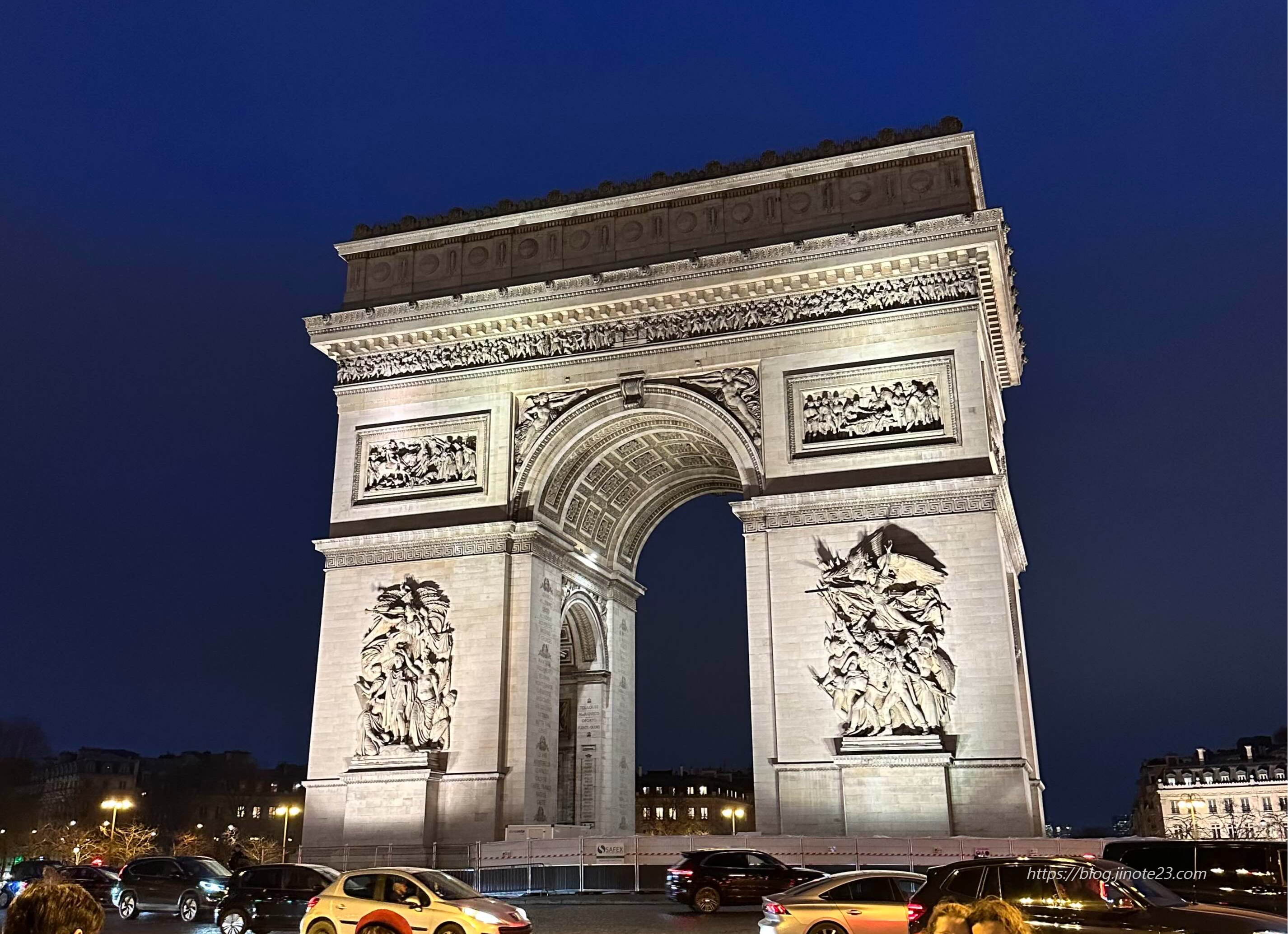 든든히 배를 채우고 개선문을 보러 갔습니다. 저녁 먹기 전에 밝을 때도 잠깐 보고 왔는데 저녁에도 조명을 켜두니 멋있더라고요.