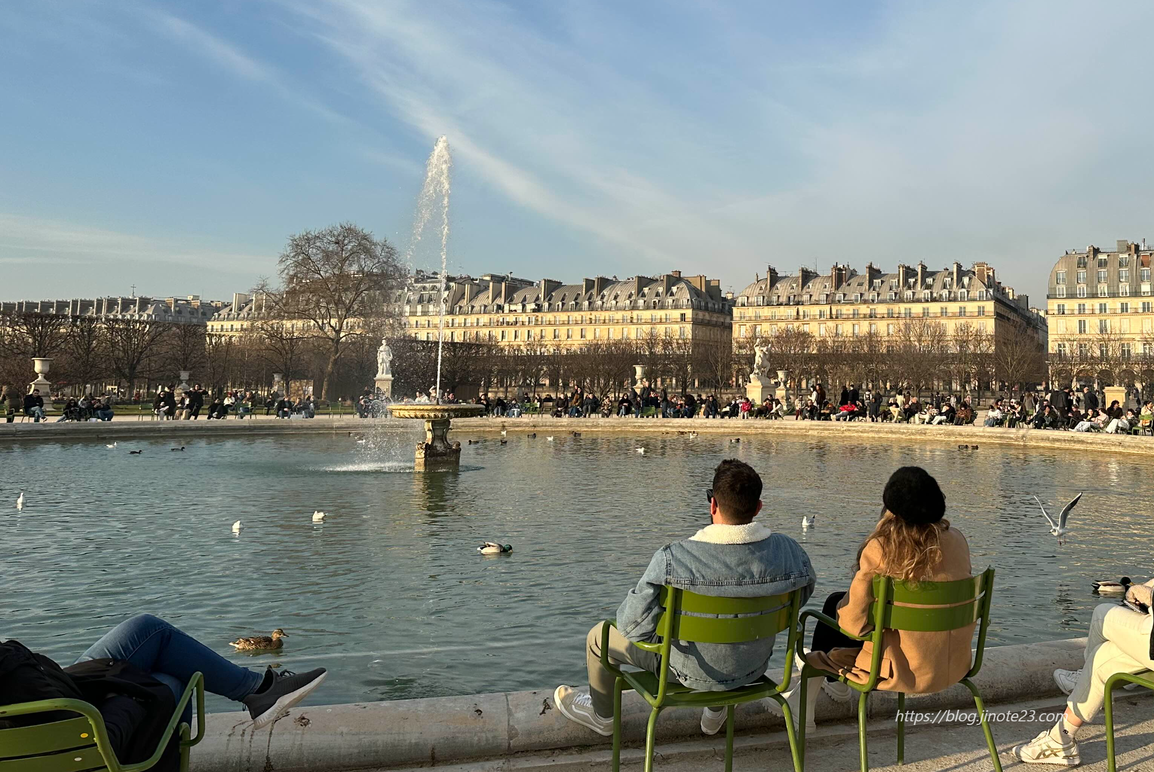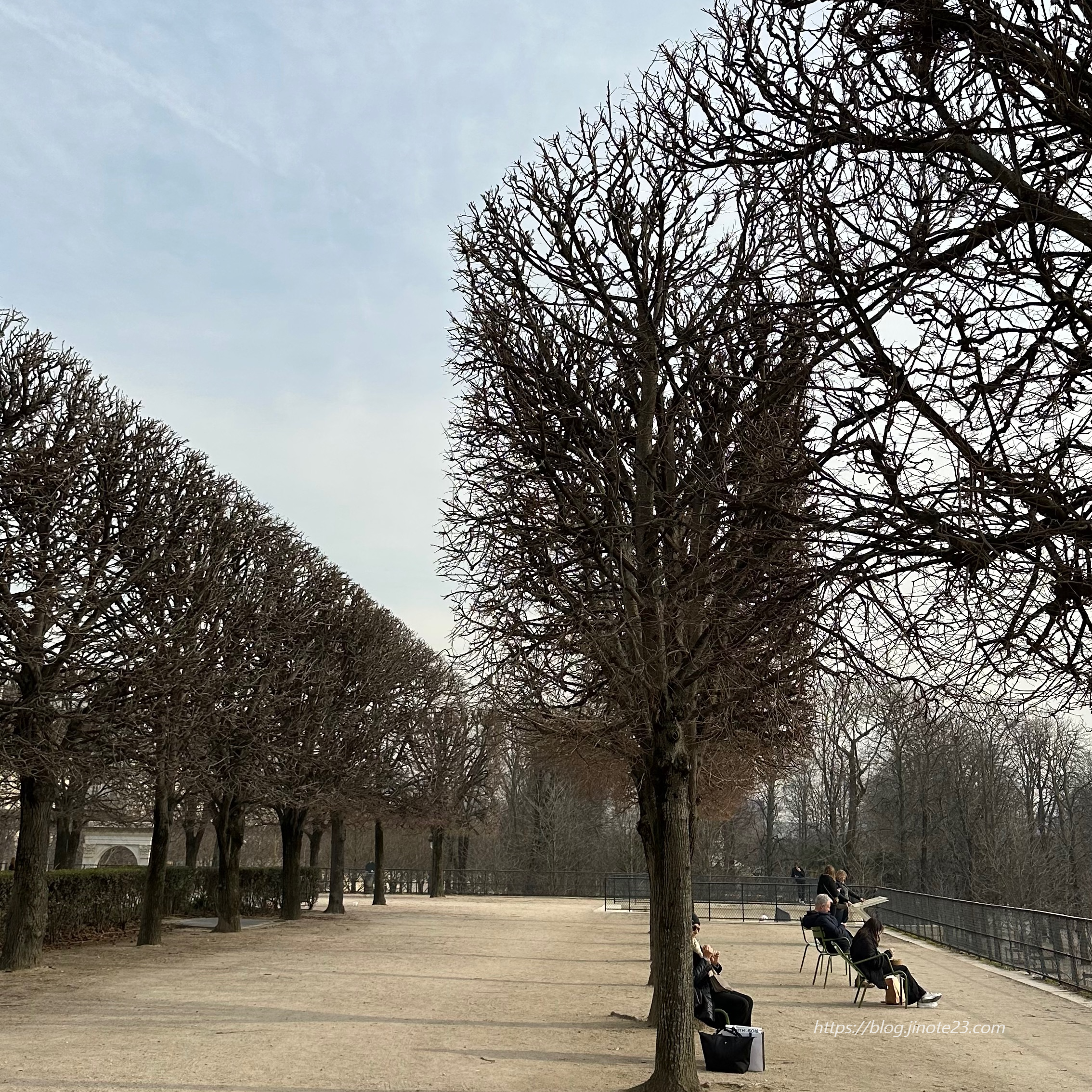 나와서 뛸르히 정원 쪽으로 걸어가는데 그 양옆에 있는 나무들 또한 정갈하게 다듬어져 있는 모습을 볼 수 있습니다. 저 길로 나오면 뛸르히 정원(Tuileries)이 나오는데 가운데 큰 분수를 중심으로 사람들이 둘러앉아 휴식을 취하고 있습니다. 다행히 날씨도 좋았어서 더욱 평온했고 더 오래 머물다가고 싶은 곳이었어요.