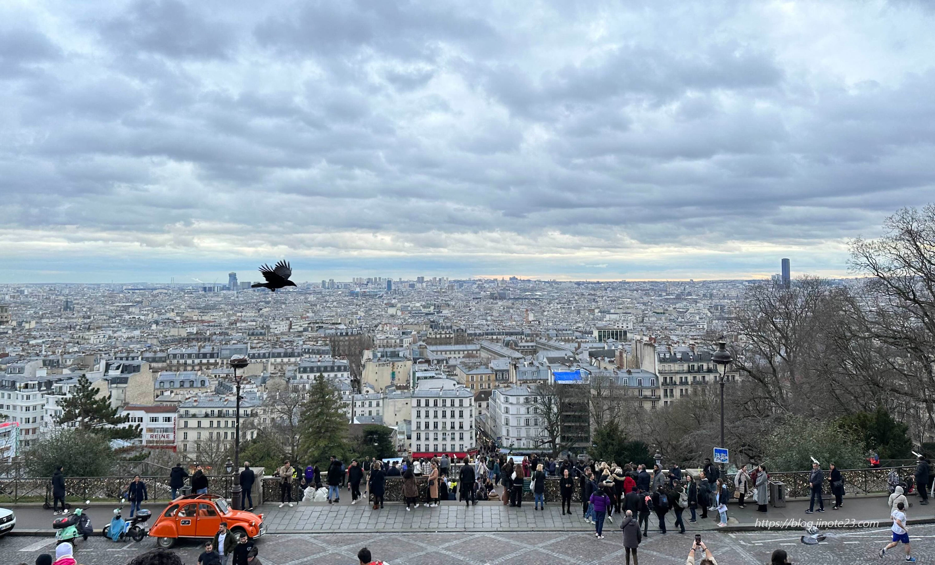 열심히 올라와서 사람들 사이를 자리 잡고 앉으면 나이스한 뷰를 보실 수 있습니다. 날씨가 좋거나 해질녘이면 더 멋졌을 것 같아요. 잠시 파리멍을 때려줍니다. 사람들이 앉은 곳 바로 뒤로 사크레쾨르 대성당을 볼 수 있어요.